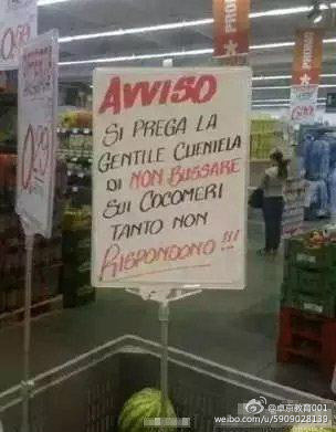 近日,新浪微博用户“孤岛守护者”发布了一个帖子称,意大利的一家超市立了一个牌子:“尊敬的顾客,请您不要再敲西瓜了,它们是真的不会回应的!!!”此则消息引发了大陆网民的兴趣,因为中国人有一个习惯,买西瓜前,都喜欢先敲敲瓜。