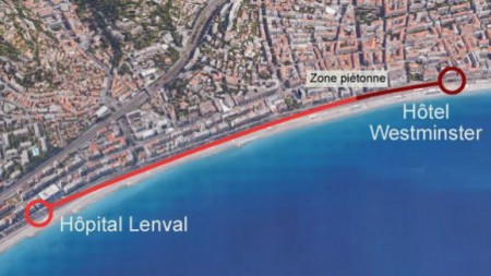 如图红色线条所示,恐怖分子从Hôpital Lenval 到Hôtel Westminster全程行驶了2公里进行恐怖袭击,深红色线处为预留给民众观赏国庆烟花的步行道“Zone Piétonne”。(FRANCETV INFO)