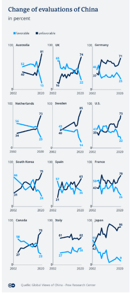 其中86%的日本民众、 85%的瑞典民众、81%的澳洲民众、75%的丹麦和韩国、74%的英国、73%的美国、加拿大、荷兰、71%的德国、71%的比利时、70% 的法国、63%的西班牙和62%的意大利民众都对中共持负面看法。居各国过去十年来最高水平。