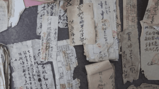 这面墙上贴满了中共八路军给老百姓打的各种白条子,这样的单据有上千份,至今没有还老百姓钱。(图片来源:网络图片)