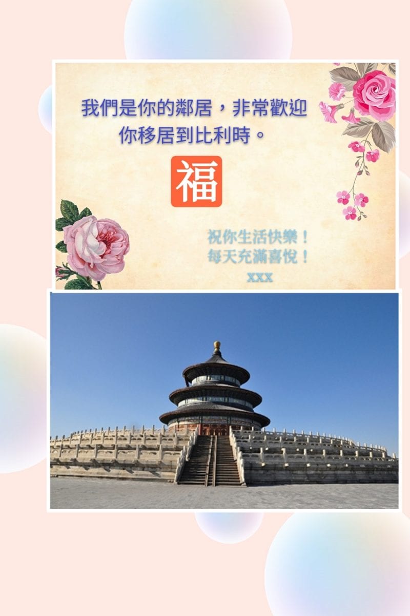 妈妈先带我去了一个邻居犹可的家。犹可是个很胖的女人,但很热情,热情的拥抱和开朗的笑容都使我深受感染。她的丈夫桑德拉不在家,但他和她一起送给了我一张贺卡,上面打的汉字是:我们是你的邻居,非常欢迎你移居到比利时。下面印了一个红底黄字的“福”,再下面又写着:祝你生活快乐!每天充满喜悦!落款是他们夫妻的签名,背面是天坛的图片。