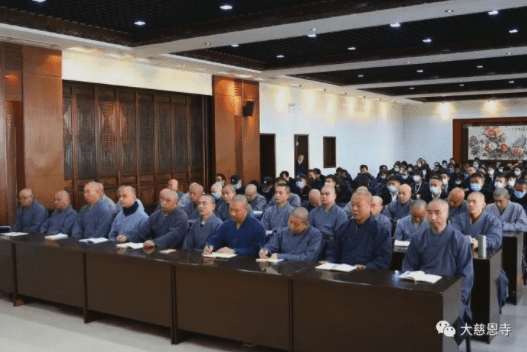 据大慈恩寺微信公众号发布的照片显示,寺庙礼堂悬挂“大慈恩寺学习贯彻党的十九届五中全会精神”的横幅,四名和尚在主席台就坐。增勤大和尚在讲话中要求和尚们进一步增强“四个意识”、做到“两个维护”,“稳步推进佛教中国化进程”,等等。