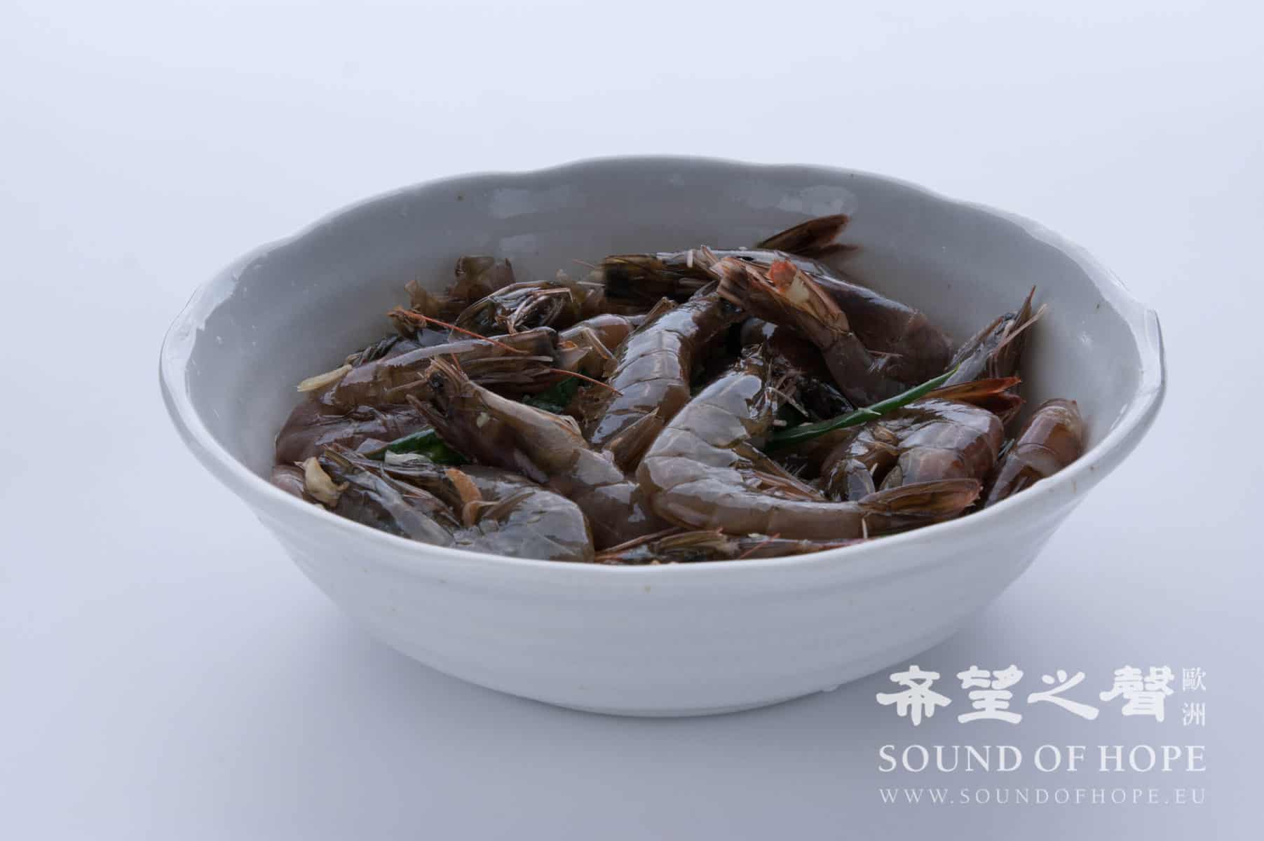 1. 将鲜虾洗净,去泥肠,修剪刺人的虾头及须。