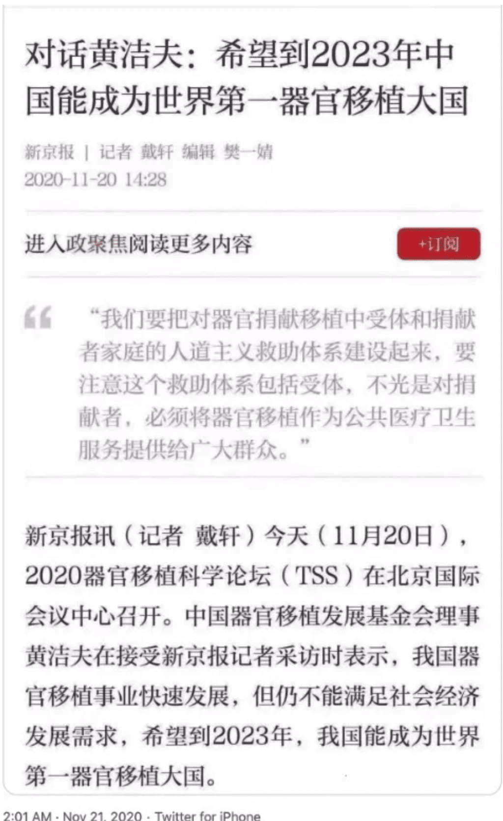 这则报道引起网友震惊,有网友惊呼道:“太TM的吓人了!原来器官移植是经济发展的需要,这得需要摘多少人呢?”