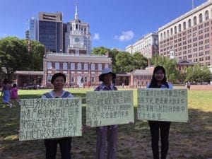 李东连(左一)在美国独立宫广场讲真相。(本人提供图片)