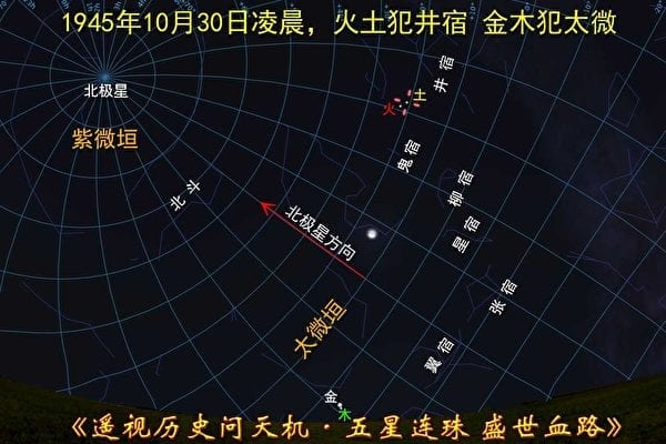 战争是保卫人民的,不是祸害人民的。中共起家就一直逆天理,逆天。为什么逆天还能得天下呢?回顾《第四十五章 水双守斗火守心,蒋公顺天解劫困》,天象图45-2,1945年福星土星在井宿,在给井宿的分野古秦地赐福,秦地出天子。蒋介石没听从章嘉大师“胜不离安,败不离湾”的预言,没定都西安顺天象接天福,盘踞秦地延安的中共,反而顺了天象——逆天理却顺天象,一个逆天的政权得天下,中华将被它祸乱,被带向末劫的深渊。