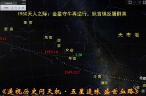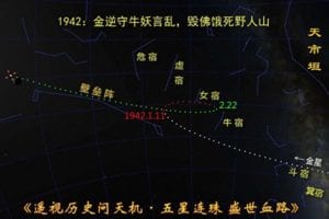 再看图66-4,1950年的天象在人间提前应验,为什么民国减寿?在《第64章 为谁扛罪遭迫害?忍辱成道天机开》中讲过:民国内战战败的直接原因,是迫害救世的主尊战神。这里对比天象:图66-3的野人山杜聿明惨败,图66-4的民国败亡的旧运程,同样的金星守牛,展现着人间的因果:民国战败的根本缘由,在1942年的天象下的杜聿明毁佛。