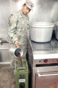 美国国防部还搞笑地说,美军随时都有咖啡喝,只要抓个纸杯,倒入咖啡,再按自己喜欢的方式调味,就完成一杯咖啡。较大一些的基地里,还有液态奶精跟假糖可以选。前线作战的官兵配给的口粮中也有即溶咖啡,搭配无焰加热器,可使咖啡立即“热到能烫嘴”,但在紧急状态下,只要用冷水冲泡用力摇一摇就能饮用。