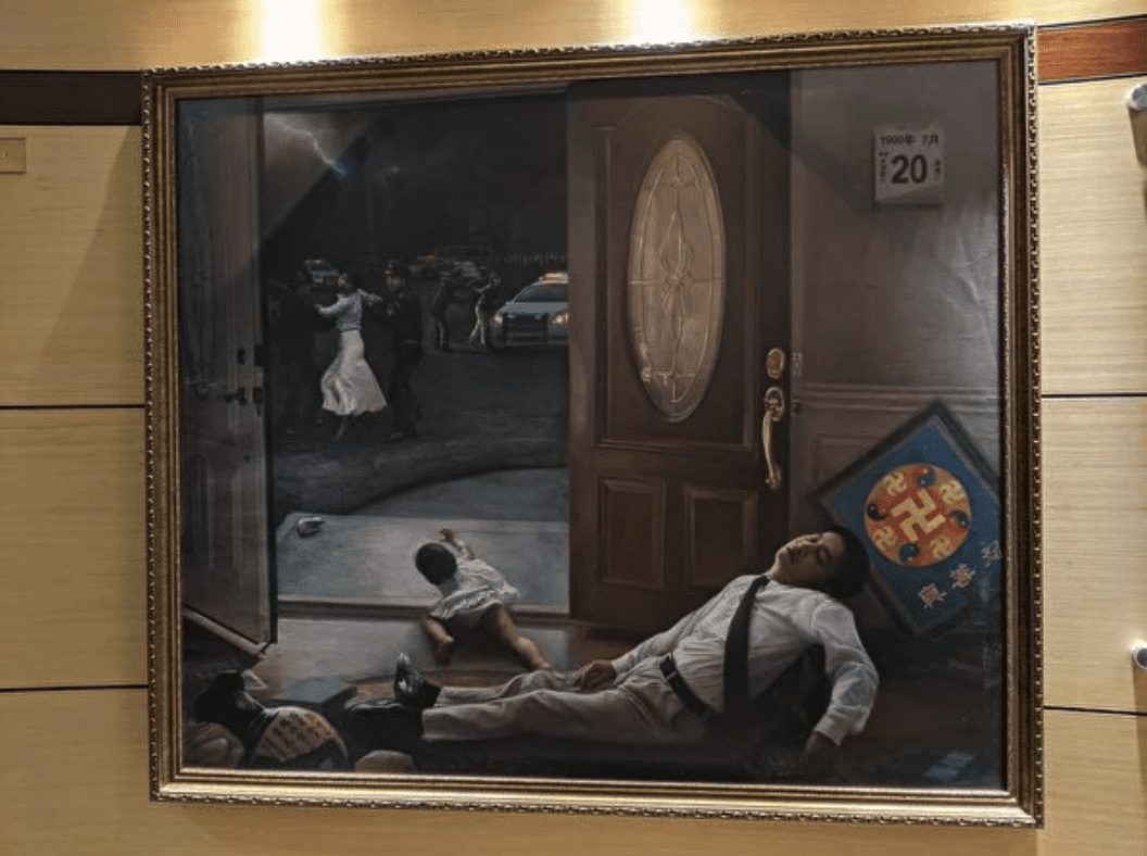 画作《苏家屯的罪恶》令基德斯顿感到震撼。画家的创作源于一位活摘法轮功学员器官的医生的妻子提供的证词。从正在被活摘器官痛苦挣扎的法轮功学员的口袋里掉出一张纸片,纸片上写着“祝妈妈生日快乐!”良知尚存的医生猛然感到自己的良心受到强烈谴责,他不能继续下去了,他意识到自己是在犯罪。