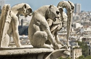 “滴水嘴兽”的英文gargoyle源自法文gargouille,表示“喉咙”。它们从13世纪(巴黎圣母院建成的年代)开始出现在欧洲的教堂,作为装饰性喷水嘴,通过将雨水从屋顶向外疏泄来保护石墙,因而也有着“净化”的寓意。