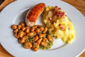 香肠和土豆泥是英国最受欢迎的食品之一,您可以在酒吧找到。 这道菜是由猪肉、羊肉或牛肉制成的调味香肠,配以土豆泥。 有时会附带洋葱肉汁,炸洋葱或豌豆。 英国的许多地区,包括约克郡Yorkshire,萨福克郡Suffolk,格洛斯特郡Gloucester和坎伯兰郡Cumberland都有自己的香肠风格。 来自英格兰北部坎布里亚郡 Cumbria 的经典坎伯兰香肠是最受欢迎的选择。 这种长而卷曲的香肠是用切碎的猪肉制成的,并用胡椒调味。
