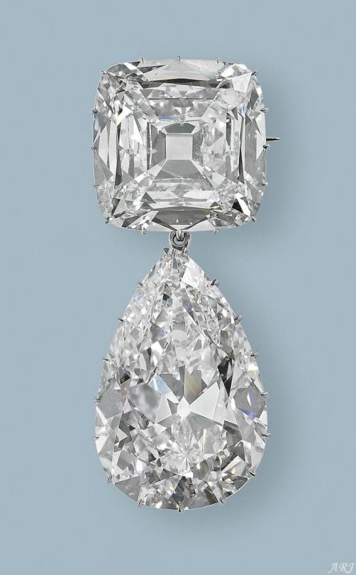 库利南三号也是水滴样式的梨形,重量94.4克拉,库利南四号是方形的,重量63.6克拉,镶嵌在英国皇室王冠之上,后取下和库利南三号组成胸针。