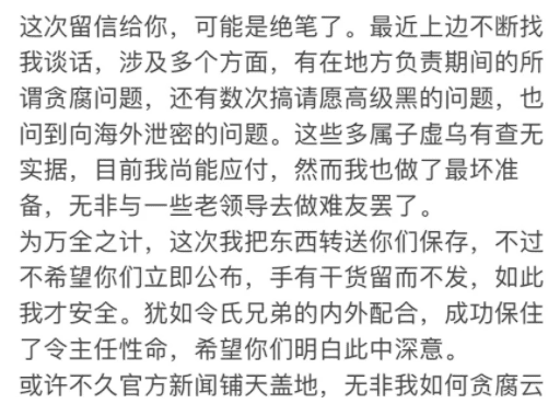 信中称,最近上边不断找他谈话,有在地方负责时的贪腐问题,也有数次搞请愿的所谓高级黑问题,还有向海外泄密问题。信中说不认这些问题,自己已做好最坏准备,预计要和老领导做难友。因此将一些材料交下,先保存留住不发,学令氏兄弟里应外合,以保性命。