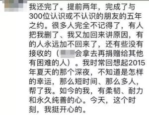 我还是时常想起2015年夏天的那个深夜,300个人不计利息的善心,我的心头一直放着300个人的信任。我想,还完的那一天,他们一定会为我开心。
