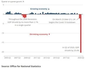 【欧洲希望之声2020年8月21日综合报道】自从病毒流行以来,经济学家一直在猜测这对经济会造成多大损失。现在上半年的统计结果出来了,英国正式进入了经济衰退期。根据国家统计局ONS八月份的报告,英国上半年连续两个季度经济下滑,国民生产总值GDP下滑了20%。这是英国从2008年经济危机以来首次进入经济衰退。
