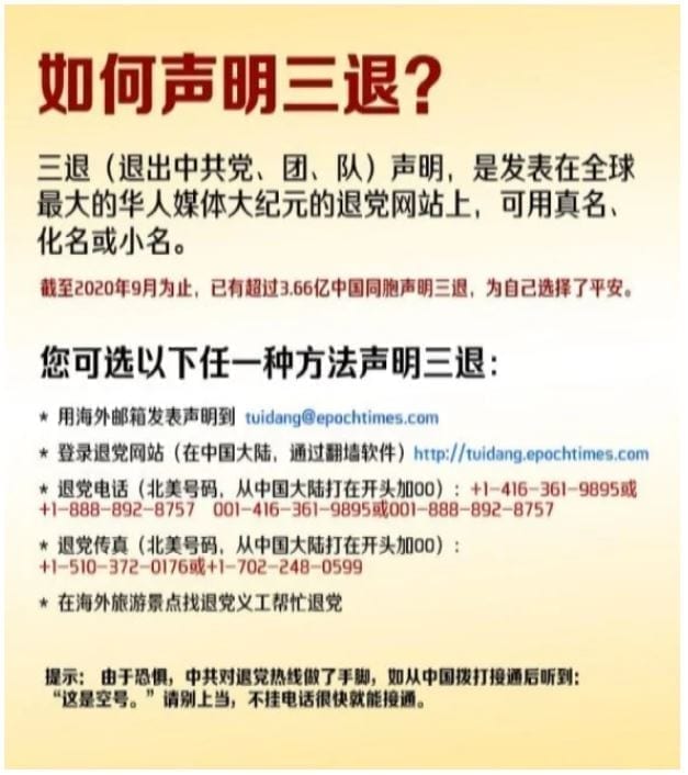 2004年,《九评共产党》问世,揭开了退出中共运动的序幕。中国民众开始觉醒,认清了中共的邪恶本质,至今已有超过3.7亿人宣布退出中共的党、团、队组织(简称“三退”)。