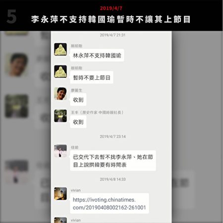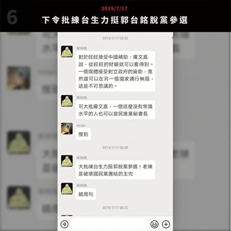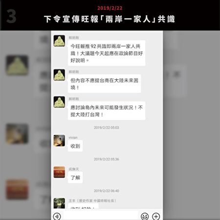 黃國昌指出,這些微信群組內的對話,清楚地呈現了蔡衍明如何直接指示旺中傳媒的新聞操作,“中天新聞,當然也不例外”。看完這些內容,再對比中天主管們在聽證會上朗朗上口的“內控自律”、“制播原則”、“品管機制”、“獨立編審”、“專業自主”、“新聞倫理”,只讓人覺得厚顏無恥、可笑至極。