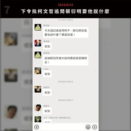 根據截圖資料顯示,該微信群組成員除蔡衍明外,還包括中天董事長廖麗生、中視董事長邱佳瑜、中時新聞網董事長賴嶽謙、《中國時報》董事長王豐、《中國時報》社長王綽中、《中國時報》暨《旺報》總主筆戎撫天、中時電子報總編輯楊維敏(微信名:Vivian)等人,蔡衍明更多次在群組中對旗下媒體高層,下達報導內容、政論節目討論方向的指示。