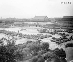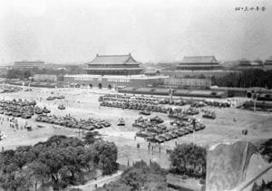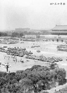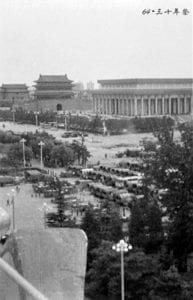 6月4日上午,天安门前及长安街上,前面是坦克,后面是装甲车,观礼台前停着军车。其中一辆坦克炮口瞄准镜头方向。
