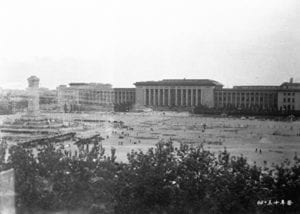6月4日天亮前,中共军队焚烧了天安门广场上的帐篷、旗帜标语,直到清晨广场上仍然飘散着烟雾,一片狼藉。远处大会堂门前的广场上直升机频繁起降。