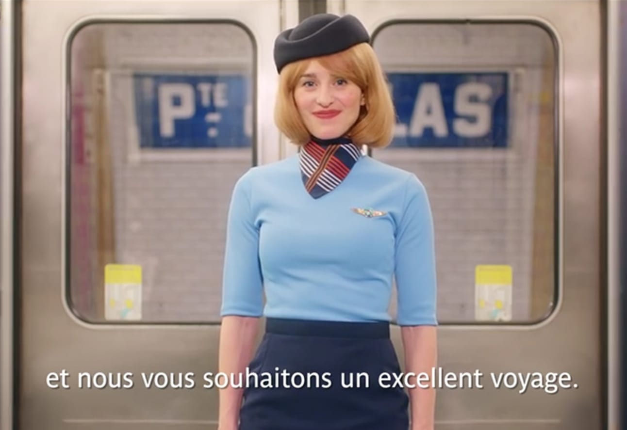 RATP印制了一批安全指南卡,详列搭乘大众交通工具的规矩。打扮成空服员的演员则在车厢里示范正确的搭车方式。