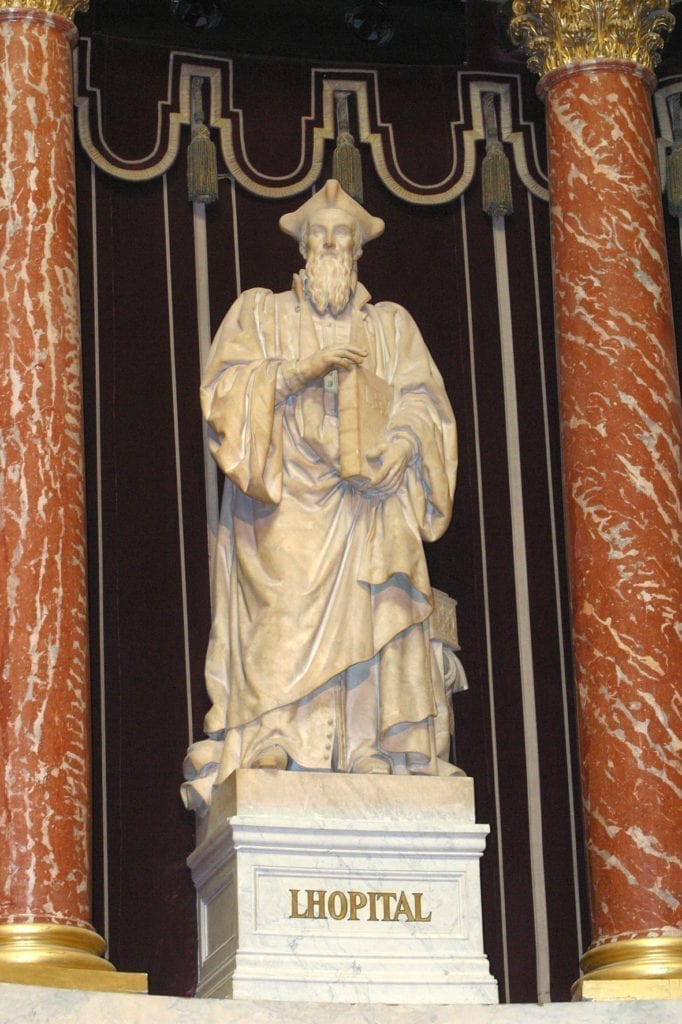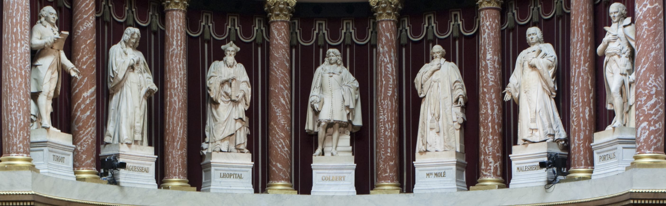 演讲台后侧小半圆弧的八根柱子之间,有7座1844至1846年间雕刻的大理石雕像,他们代表了伟大的立法者及旧制度与第一帝国时期的政治家:经济学家杜尔哥(Turgot,1727-1781年,经济学上重农学派的重要的代表人物之一)、莫莱伯爵(Molé,1781-1855年,1836年任七月王朝的首相)、大法官杜加赛(d’Aguesseau,1668-1751年,1717-1722及1727-1750年任大法官)、洛比塔(L’Hospital,文艺复兴时期法国掌玺大臣,支持对宗教宽容)、柯尔贝尔(Colbert,1619-1683年,长期担任法国财政大臣和海军国务大臣,是路易十四时代最著名的伟大人物之一)、马勒塞尔布(Malesherbes,1721-1794年,1750年任新闻出版总监,以其开明政策闻名,批准启蒙运动哲学家出版其著作,如狄德罗的《百科全书》)、波塔利斯(Portalis,1746-1807年,民法法典起草人之一,入葬先贤祠)。