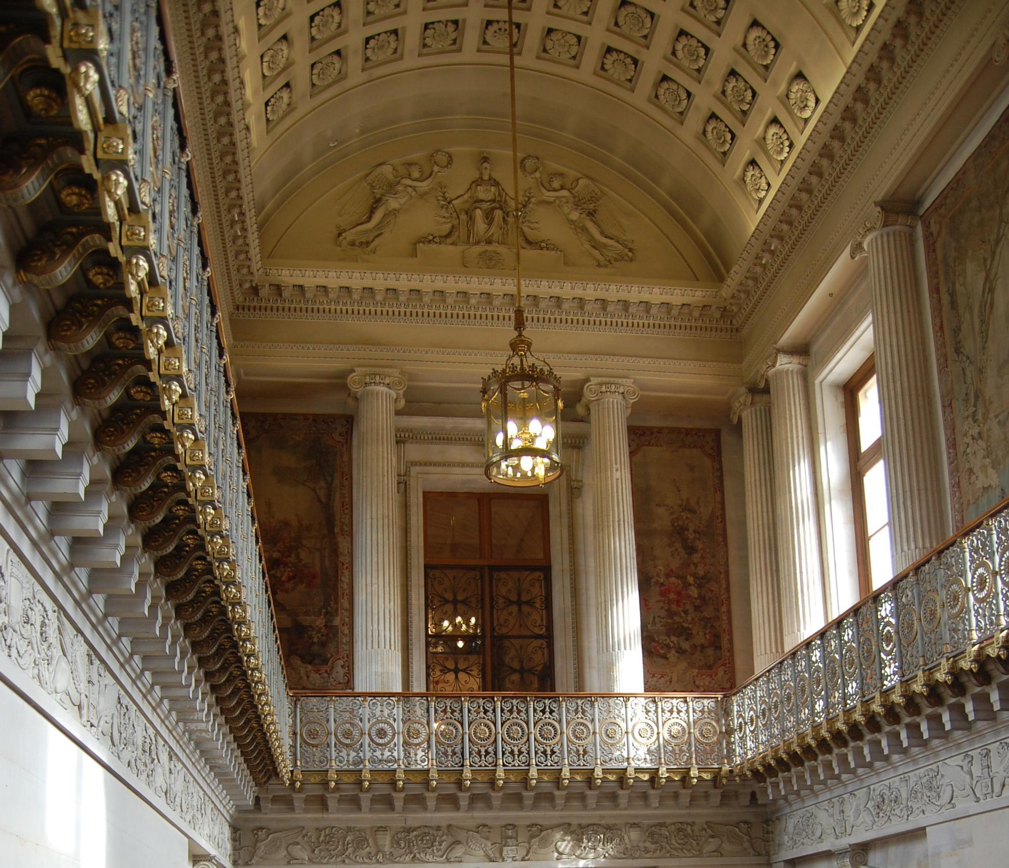 主楼梯的台阶间装修有6只古老的石狮子,楼梯的栏杆建于第二帝国时期,往上还有一层非常壮观的平台供人们驻足。
