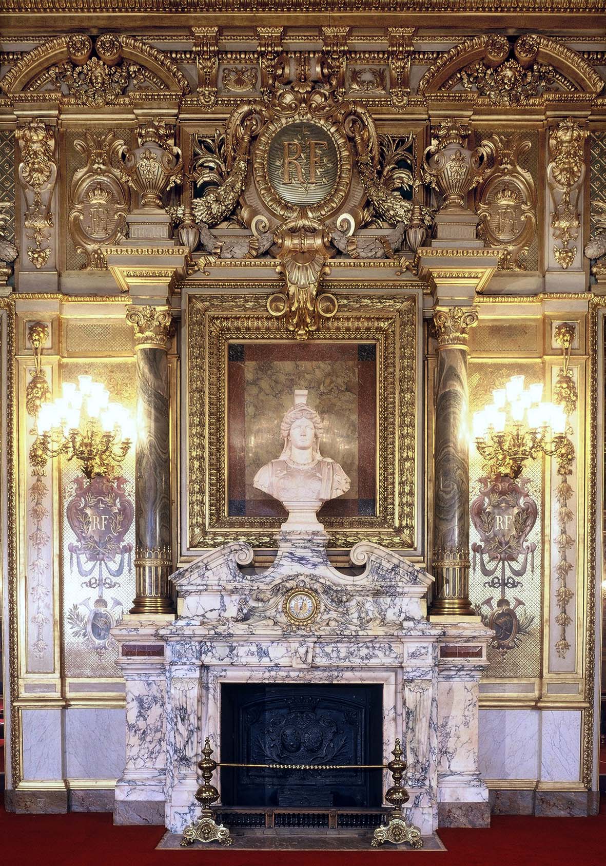 大理石壁炉上是雕塑家克莱辛格(CLÉSINGER,1814-1883年)塑的半身像,旁边是四座大理石的寓意雕像,分别由南特伊(Nanteuil,1792-1865年)和斯玛尔特(Simart,1806-1857年)雕刻,展现了商业(Le Commerce)、工业(l’Industrie)、艺术唤起诗歌灵感(l’Art demandant ses inspirations à la poésie)等主题。