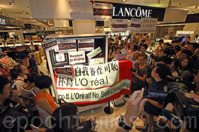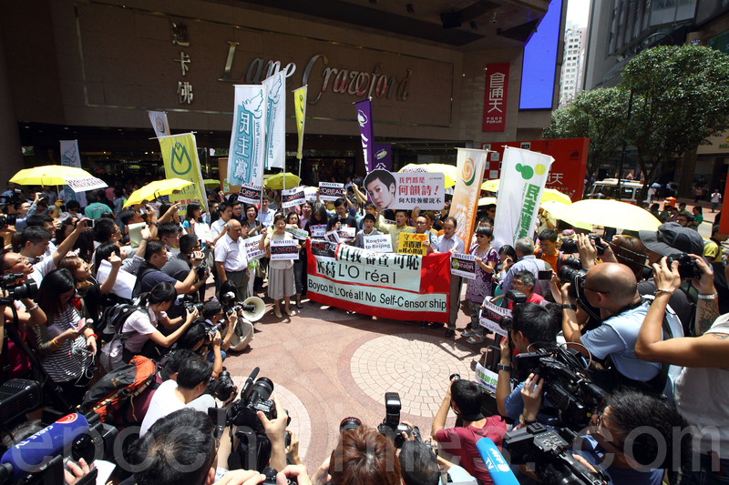 抗议人士高喊“自我审查可耻、杯葛LANCÔME、杯葛L’Orea、不要自我审查。”口号。