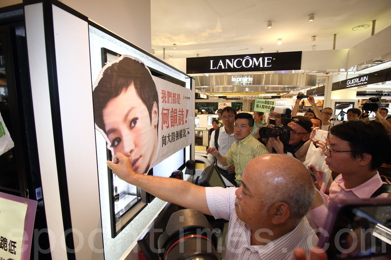 抗议人士进入LANCÔME门市贴上抗议标语,并高喊口号,近百传媒到场。