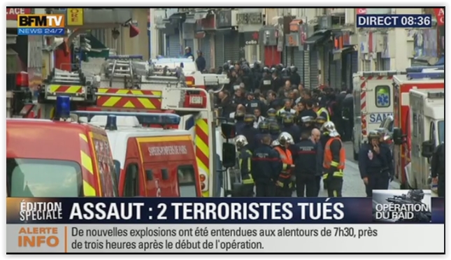 8:30 据BFMTV采访一名居民表示,早上突击事件听到枪声持续约1个小时。