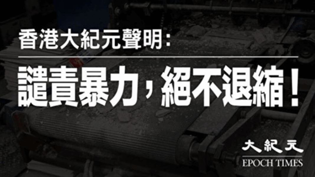 大紀元集團譴責歹徒的行爲,也譴責中共邪惡勢力對自由和法制的破壞。我們認爲,這些歹徒破壞行動的目標,不僅針對香港大紀元時報,也是針對香港社會的自由媒體,更是對新聞言論自由這些基本社會原則的惡意破壞和攻擊。