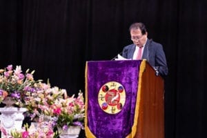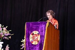 “法轮大法好,渐入世人道;众生切莫急,神佛已在笑。”交流会主席台两侧竖幅上发出振奋人心的信息,该文出自李洪志先生的著作《洪吟二》。会场神圣庄严,鲜花溢香,“法轮大法”和“真、善、忍”几个大字闪耀着光芒。在会场的环形电子屏幕上,普天同庆之景壮观辉煌。现场的一万余名弟子与全世界亿万弟子,共同敬贺法轮功创始人李洪志先生华诞。