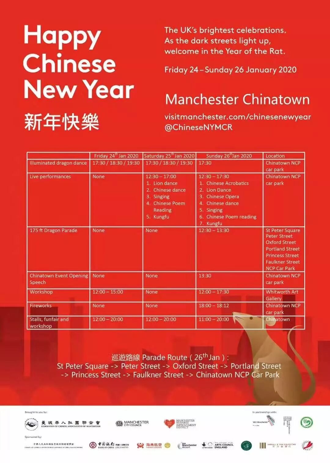 活动:利物浦鼠年的新年庆祝活动依然将在欧洲最古老的中国城隆重上演!除了传统节目舞狮舞龙表演之外,活动现场还有大量贩卖过年期间中国风礼品的集市和美食街头小吃,以及烟花爆竹表演秀呢!