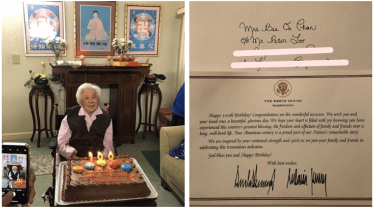 美国旧金山的一位华裔老人最近过百岁生日时惊喜收到川普总统夫妇的亲笔签名贺信。(图片由本人提供,SOH合成)