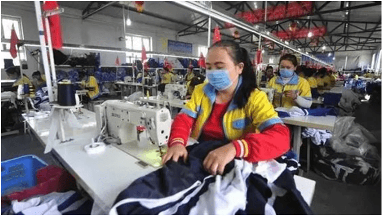 疫情期间中共以扶贫为名建立的工厂,近三百人中大多为维吾尔女性。(网络图片)