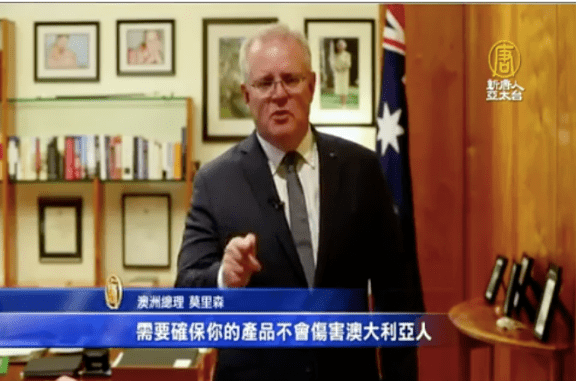 澳洲总理莫里森说:「你需要承担责任,需要确保你的产品不会伤害澳大利亚人。我的政府将尽一切努力追究你的责任。」(图/新唐人影片截图)