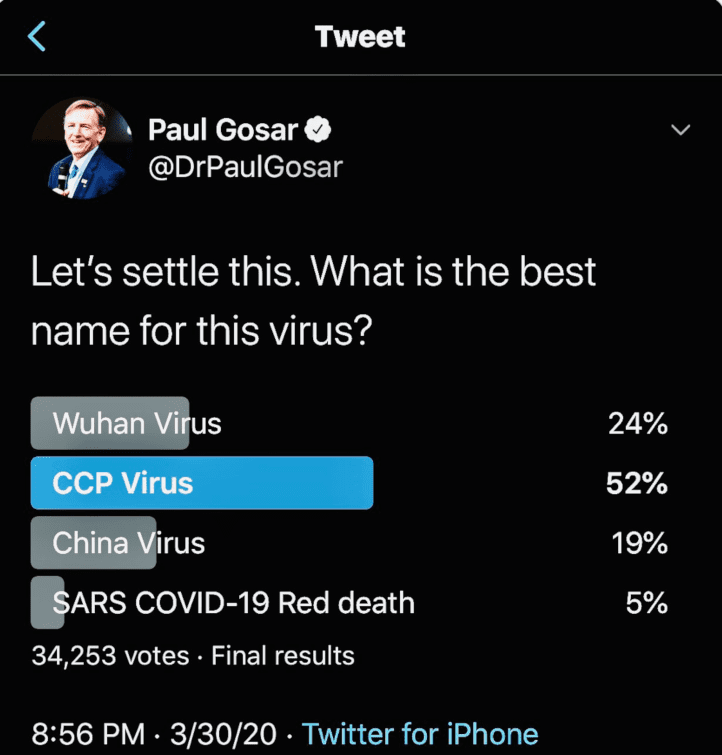 美議員發起網上投票為病毒命名 「中共病毒」高票當選(推特截圖)