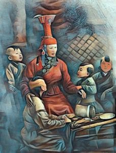 转眼到了成吉思汗的父亲也速该身为乞颜部孛儿只斤氏首领、蒙古部落盟长的时期。也速该,蒙古族的一位勇士,刚毅但不乏柔情。一天,他在斡难河畔放鹰捕猎时,遇见了从斡勒忽讷兀惕部娶妻回来的篾儿乞惕部人也客赤列都。他对其美貌无比的妻子诃额仑一见钟情,遂与兄弟三人追赶马车,选择了草原上获取新娘的第二种方式:抢婚。也客赤列都想方设法摆脱他们,但无济于事,最终,诃额仑成为了也速该的第二个妻子,即“诃额仑兀真”。兀真,即汉语“夫人”之意。他的第一个妻子名叫索济格勒,有一个儿子叫别克帖儿。