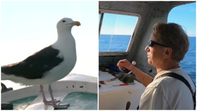 海鸥“红眼”为了船长马科夫斯基(John Makowsky)的救命之恩,15年如一日陪伴他出海捕捉龙虾。(视频截图)