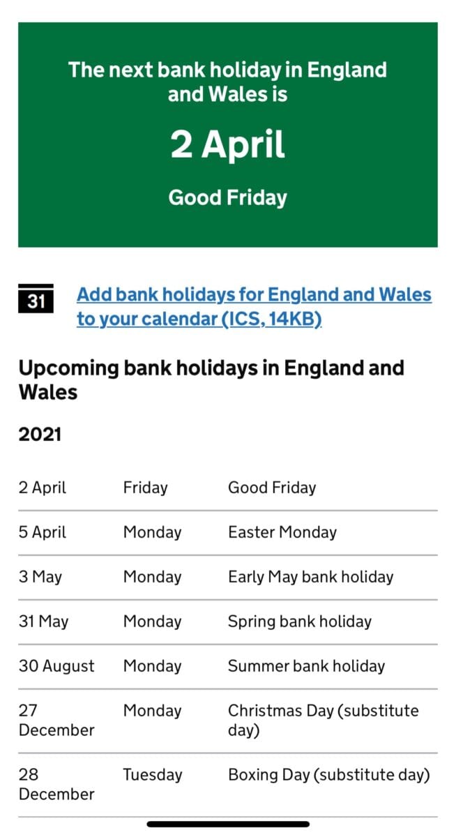 英格兰和威尔士即将来临的银行假期(图片来源:英国官网)