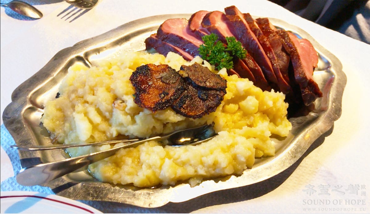 熏肉配土豆泥是这里的重头菜,光闻香味已经垂涎三尺,土豆泥是用黄油和洋葱一层一层叠好,再用慢火炖烤而成,入口即化,配上自家地里新鲜摘的沙拉菜,真是再美味不过了。