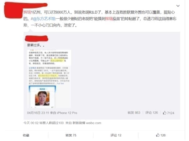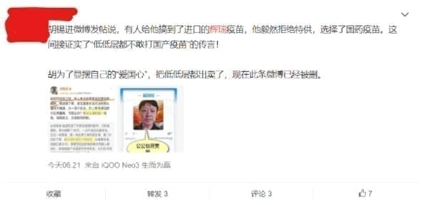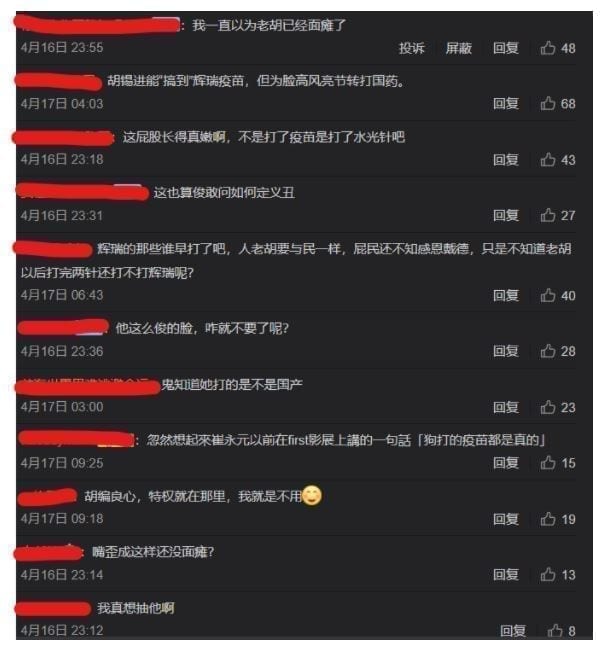 “环球胡总编前两天在微博上说,有人可以通过关系让他打上辉瑞疫苗,但他拒绝了,最终还是选择国产灭活疫苗。这一方面说明胡总对国产疫苗的信心,但另一方面是因为胡总还是怕被打脸,他不想再出现用苹果手机发微博力挺华为手机这样让人嘲笑的状况。以胡总为代表的一些人及媒体之前不遗余力地渲染辉瑞疫苗的副作用,说打了之后有多少人死亡多少人面瘫。然而,国内一般普通人其实是打不到辉瑞疫苗的,反而让有的人看了这些宣传后对包括国产疫苗在内的所有疫苗都心存疑虑,打疫苗的积极性并不高,这大概是胡总他们当初没想到的。”