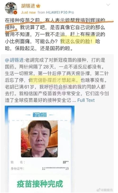 4月16日,中共官媒《环球时报》总编胡锡进在其个人微博账户上分享了自己接种国药疫苗的经历,并给国产疫苗做宣传,称其已完成了2针疫苗的接种,前后共间隔28天,“一点不适反应都没有”。还说他在接种第一针后就停了2天的俯卧撑,第二针后忘记了,直到做完俯卧撑才想起来,说自己“啥事没有”,“我呼吁符合标准的我的同龄人都去打”。