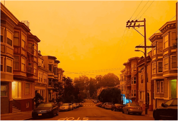 金门气象服务机构的气象学家扬·诺尔(Jan Null)给出了解释:我们上空汇聚了有三至四个不同的烟雾层,这些烟雾来自俄勒冈和北加州的多场野火;野火造成的大量烟雾被大火产生的热量推到大气中,盘旋在城市的高空;也正因为大部分烟雾处于高空,所以人们看到天空变了色,但却闻不到太多烟味。不过其中体积较大的烟尘颗粒会从空中落下,落在我们的车子屋顶上。