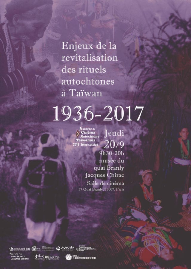 继2018年5月14日于巴黎塞纳河畔的布朗利河岸博物馆成功举办第一届台湾原住民电影日之后, 第二届法国台湾原住民电影日将在9月20日9h30~20h,再度在布朗利码头博物馆电影放映厅盛大举行。主题设定为«台湾原住民族祭仪的复振与挑战1936-2017»。
