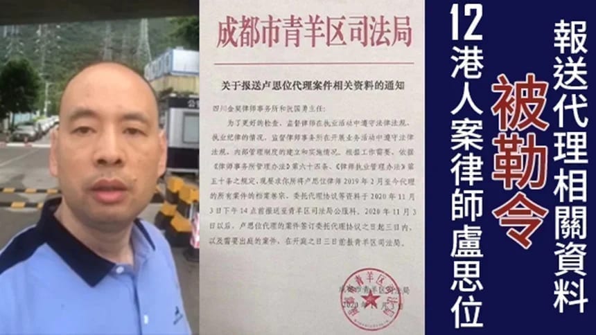 卢思位工作的在四川金契律师事务所在周二(3日)收到成都青羊区司法局的通知,勒令其报送其代理相关资料。(图片来源;自由亚洲)