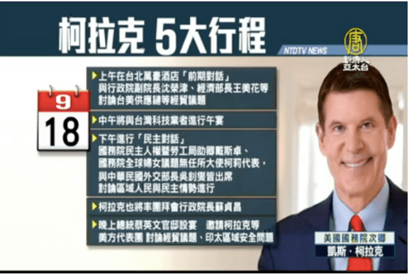 美國國務院主管經濟成長、能源與環境次卿柯拉克(Keith Krach)今天(18日)訪臺首日安排了緊湊的5大行程,上午在臺北萬豪酒店展開美臺經濟商業對話「會前會」; 中午與臺灣科技業者共進午宴,下午則進行「民主對話」; 稍後又拜會行政院長蘇貞昌; 而晚間將在總統官邸與蔡英文總統會面,除了經貿議題外,預料也會觸及印太區域安全問題。