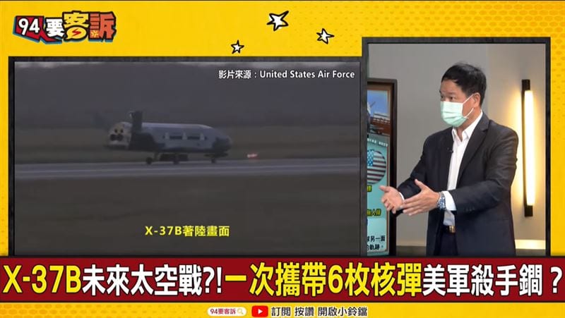 张延廷在《94要客诉》提到,X-37B目标是7分卫星3分核打击,第一功能是用来对人造卫星进行摧毁、拦截及捕捉,第二才是搭载核弹,对地球做攻击。张延廷表示,X-37B有三个重点,一、可重复使用,成本低战略价值高,二、可在地球另一面进行变轨,让敌人找不到,三、在太空轨道中有制高点优势,25倍音速飞行,从大气层外投入导弹将达到极音速,敌人很难拦截。资深媒体人黄创夏也补充,2019年X-37B进入地球轨道环绕780天,不仅苏联和中国的卫星,全世界的卫星都没找到它在哪里,当X-37B降落时,美军穿核生化装备来接机,是真的有可能实验在X-337B上搭载核弹。
