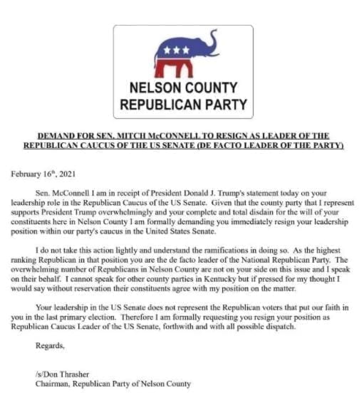 该县共和党负责人塔拉瑟(Don Thrasher)2月16日(周二)发表的书面声明指出,在川普总统发布质疑麦康奈尔领导能力的信函之际,他代表当地共和党委员会呼吁麦康奈尔应马上辞职。